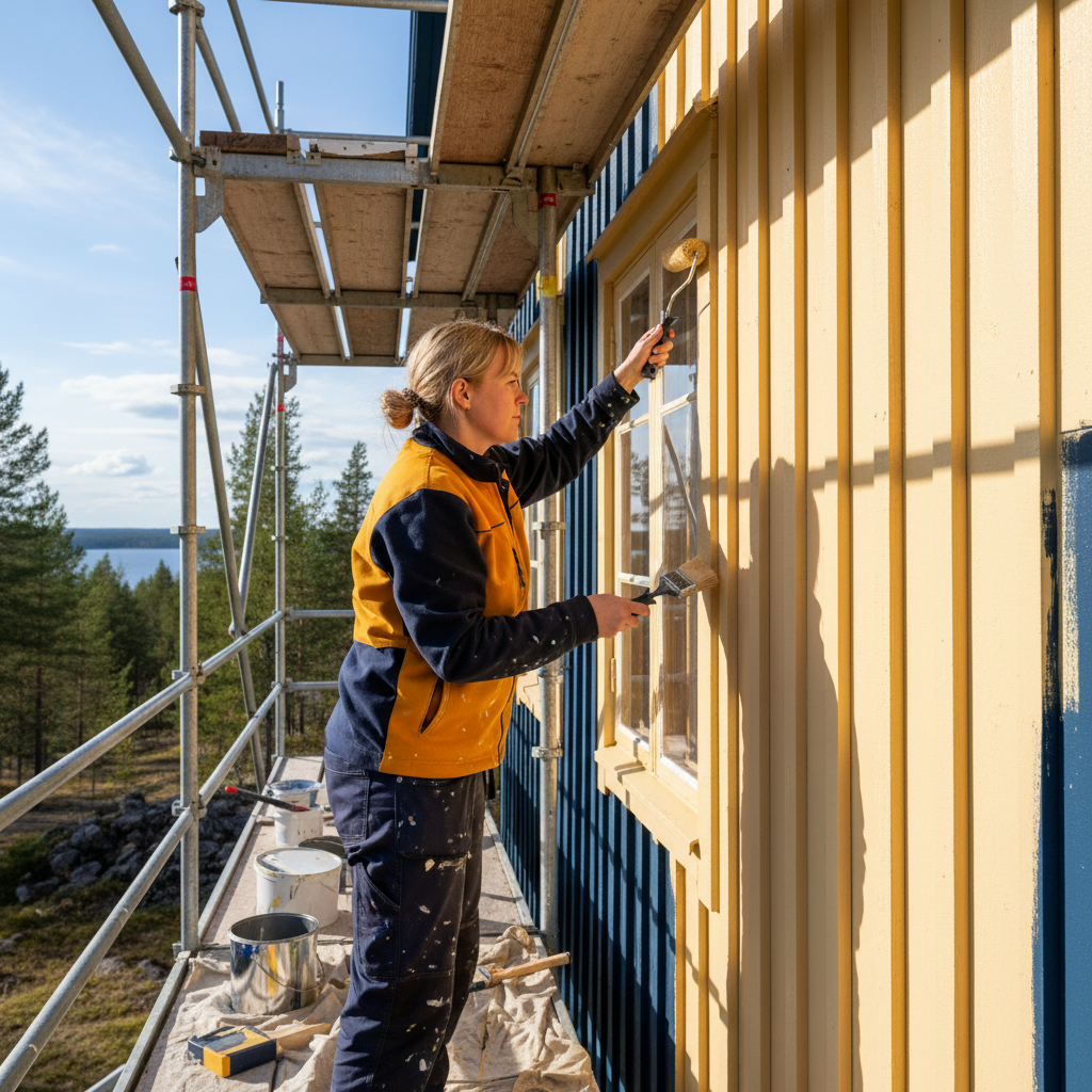 Ulkomaalaus puu- ja peltipinnoille. Pohjatyöt, pesut, hilseilyn poisto ja viimeistelty maalipinta.